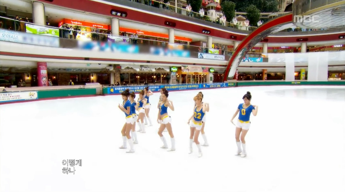 옥상과 수영장 뒤에는 3대장으로 손꼽을 수 있는 레전드 무대인 '아이스링크캠'. 『Oh!』 치어리더 컨셉으로 럭비장 이런 곳으로 행사를 다니던 소녀들은 뜻밖의 한여름 속 아이스링크에서 무대를 맞이합니다. 바닥이 얼음가득이지만 사실은 춤추는 부분에는 하얀 매트가 깔려있다는 점.... 아무튼 이번에도 특별한 세트는 없지만 아이스링크가 '극초초초대형 반사판'의 역할(?)을 해줘서 그런지 다들 뽀샤시하고 한없이 밝게 나왔어요(태연이는 코가 없고 유리는 밝게 빛남ㅋㅋㅋㅋㅋㅋ) 우리 0표아가씨(아님 01인데 1이 빠져서 0인 0순위임...)는 사이드에서 귀여움을 발산하고 계십니다(웃음) 내부에 관객을 들일 수 없어서 링크장 주변으로 깨알같이 관객이 몰려들어서 지켜보고, 롯데월드에서 내려다보고있는 시민들의 모습이 무대와 굉장히 이질감이 있어서(웃음) 재미있는 한장면을 만들기도 했죠. 이쯤되면 증말 아이돌은 극한직업(토닥토닥)
