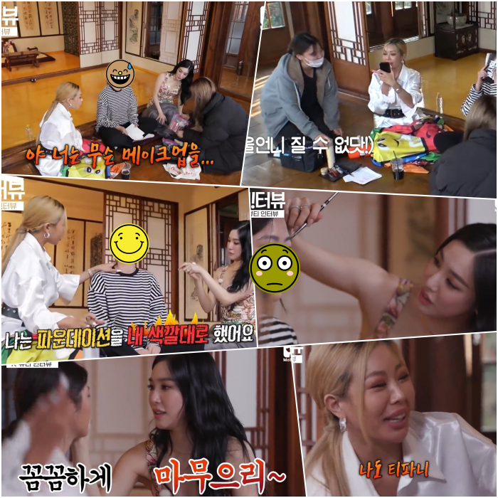 누구보다도 뷰티와 패션에 정성인 사람 쏴리질럿?!?! 토크 중 미니코너로 여성 스탭의 얼굴 메이크업 해주기 대결을 하게 되었는데... 메이크업에 찐 진심이신 분이 또 여기 계시지않겠어요? 잠깐 할거라는데 어쩐지 둘다 열이 올라서 간단한 수정파우치만 들고 들어왔던 처음과 달리 갑자기 메이크업 박스가 쏟아지고, 각 코디들이 우런니 뒤질세라 막 쌓아놓고(...) 여튼 그런 전쟁통(?) 속에서 메이크업 대결을 이어가는 두 사람. 근데 이와중에도 나름 메이크업 철칙은 있어서 꼼꼼하지만 빠르게 터치를 해나가는 파니와 달리 제시는 스탭도 자기 스타일로 일단 까무잡잡 피부에 입술만 크게....(?!?!).. 사실 이 광경에 이기고 지는건 둘째 문제고, 얼굴을 맡기고 심지어 이게 방송으로도 나간다는 사실에 마냥 불안하기만 한 스탭의 표정은 상관 1도 없이 두 K아티스트끼리 서로 우왕좌왕하는 게 너무 웃겼어요. 앞에 너무 진지한 인터뷰 하다가 이러기냐곸ㅋㅋㅋㅋ