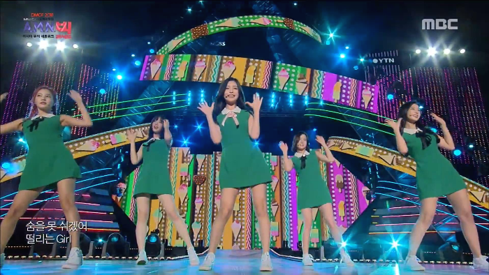 배경화면이 너무 발랄해서 가뜩이나 소녀소녀한 트와이스를 더 발랄상큼하게 만들어주는 것 같아요. Gee의 트레이드 마크인 청바지+흰 신발(롤러스케이트)를 연상시키는 컨셉이 가장 먼저 눈에 띄고 색색깔의 티셔츠로 개성을 나타내는 시도도 좋았습니다. 가끔 관객석을 비춰주는데 워낙 유명한 곡이라서 그런지 많은 이들이 가수에 상관없이 따라 부르고 있는 장면이 뿌듯하기도 하고 자랑스러웠네요.