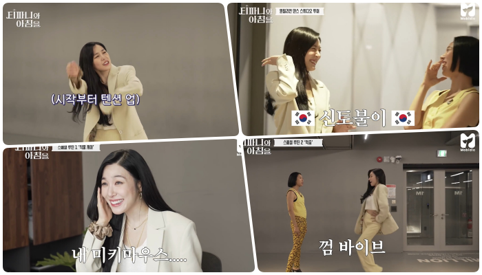 사무실 투어가 끝난 후 역시나 원밀리언의 대표적인 장소는 연습실. 오늘따라 굉장히 루즈한 핏의 정장차림이어서 오늘은 토크를 중점으로 하려나(?)란 생각은 저리치워.. 오프닝부터 쉴 새없이 이어지는 댄스의 향연(아...내 눈감아...) 그냥 노래를 틀어놓고 짜여진 안무대신 생각없이 움직여보라는 오늘의 두번째 루틴. 짜여진 안무에 직업병이 있는 파니는 처음엔 좀 머뭇머뭇하다가도 역시 짬에서 나오는 잭슨황 바이브(.......) 껌 씹으면 댄스 바이브가 더 잘나온다며 뜬금없이 껌을 공유하고.... 온 몸을 펄럭여가며 춤을 추기 시작하는 파니의 찐텐션에 당황하는 리아킴의 표정을 보실 수 있습니다(웃음) 하지만 역시 곧 <걸스플래닛999>에 함께 출연하는 선미의 대표곡 「가시나」를 같이 춰보기 시작하는데... 이 때 잠깐 배운건지 원래 알고있었는지는 모르겠지만 선미의 느낌이 잘 살아있어서 놀랐었어요. 다음 콘서트 커버곡은 선미 가즈아!!!!